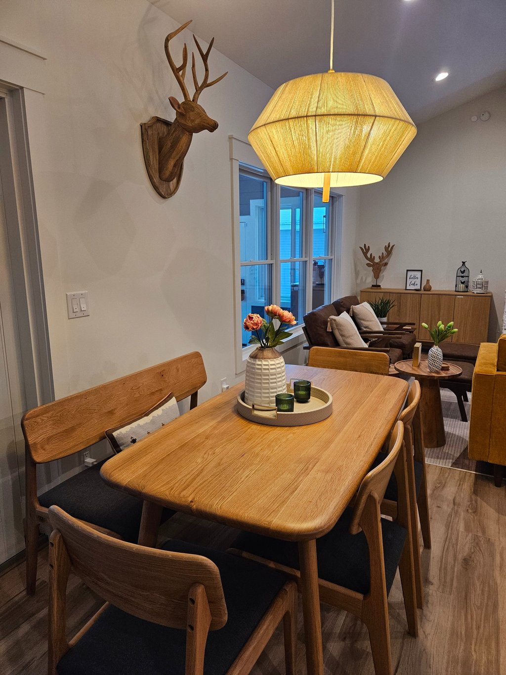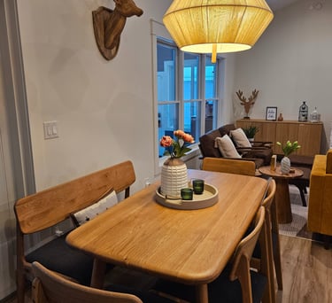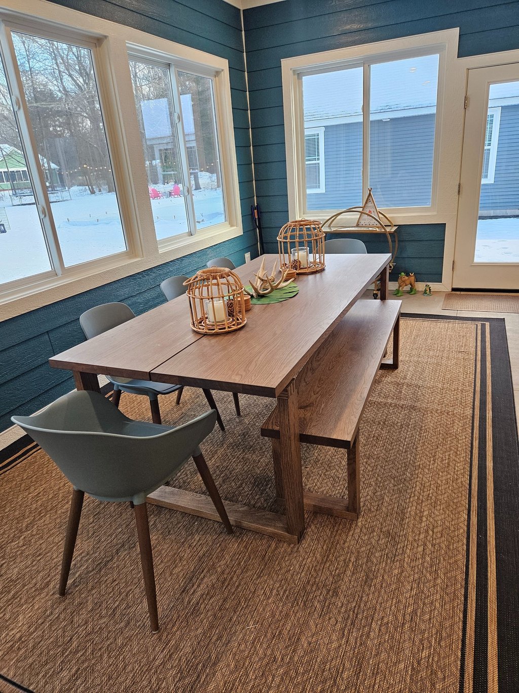 Separate dining table with padded chairs and bench seating