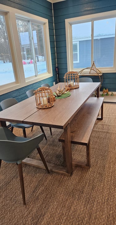 7-foot solid wood dining table with dining chairs and bench seating