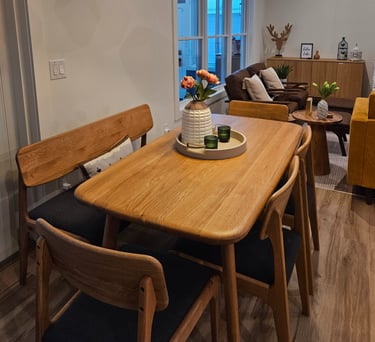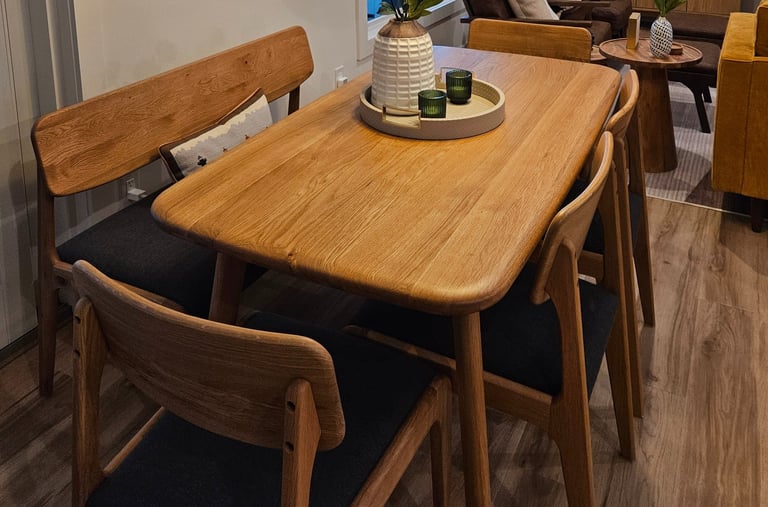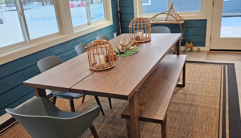 7-foot solid wood dining table with dining chairs and bench seating